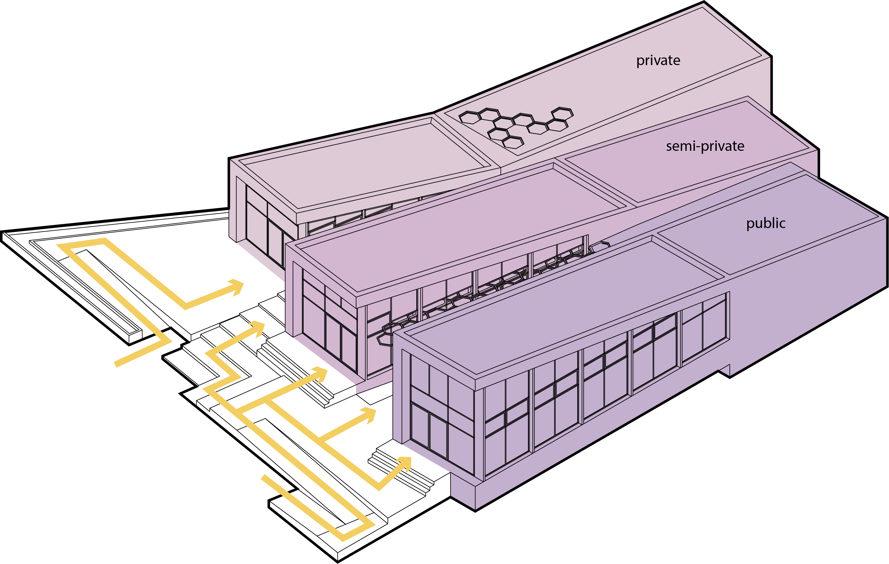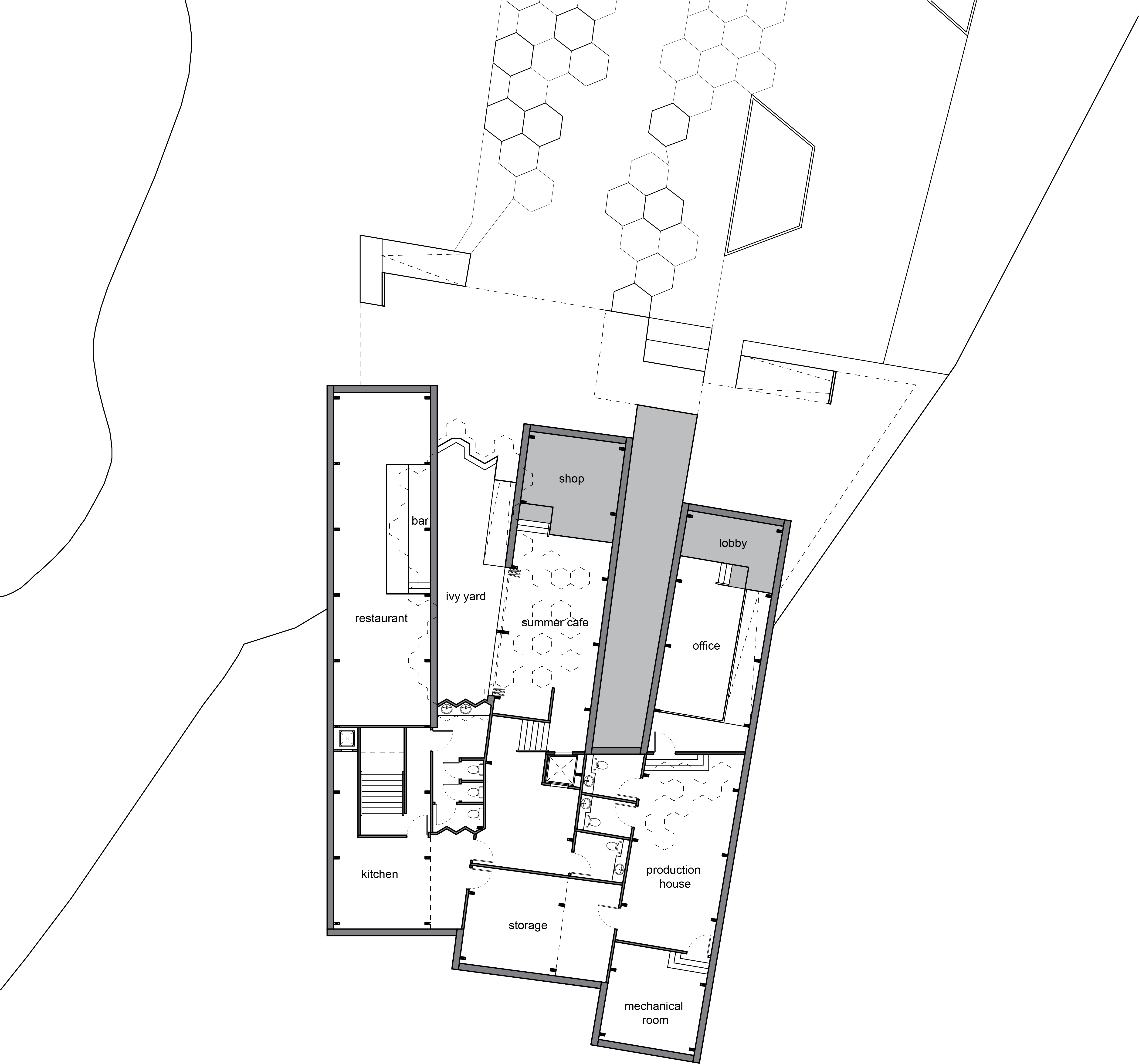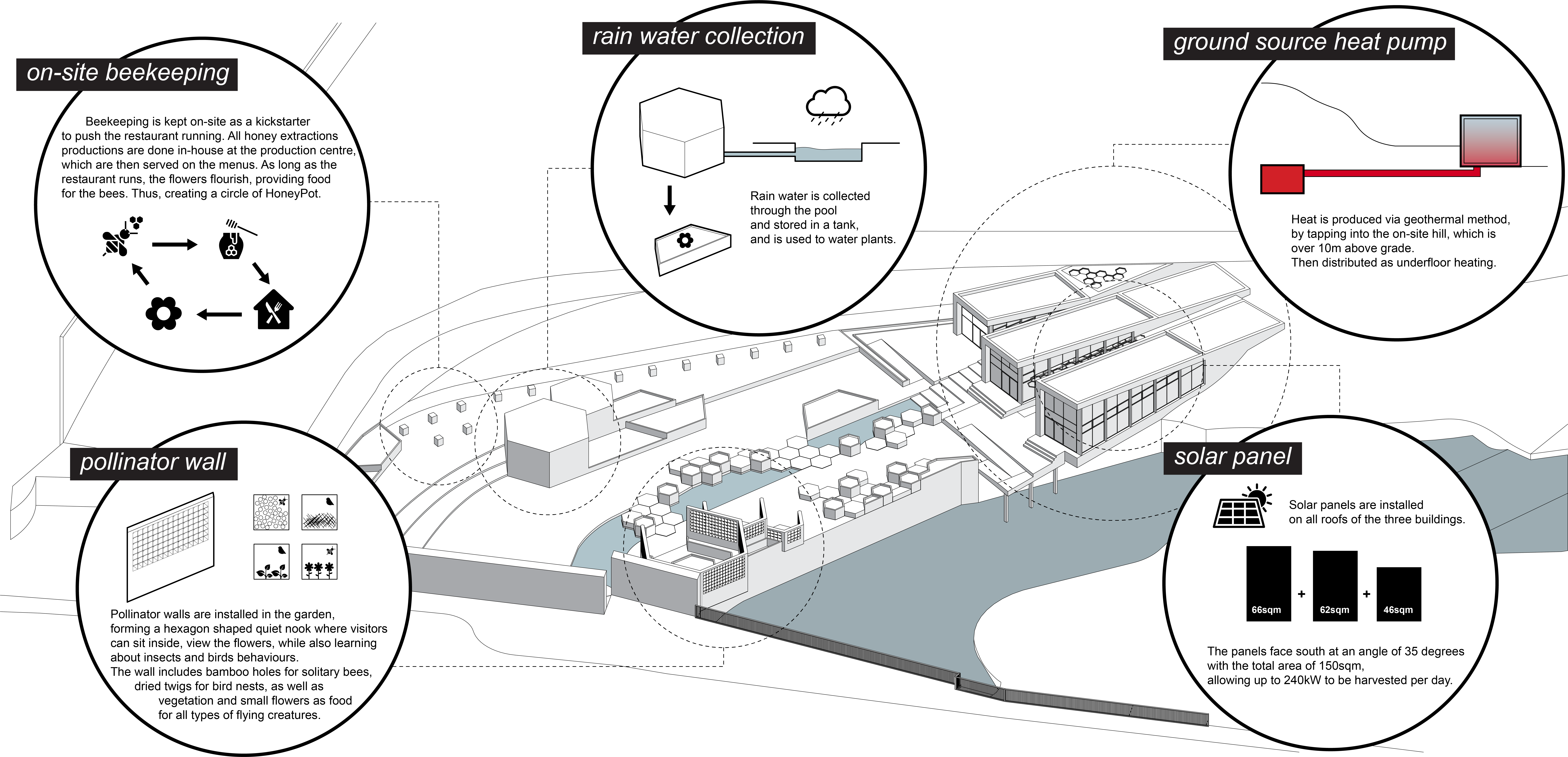 The building structure is separated into three sections, all serving different purposes. The far west section, with best view to Water of Leith, is the restaurant, which is the most public. It is open year round at night time, for only dinner will be served due to limited local honey resource. The centre section operates as both a shop that opens year round and a cafe that only opens in the summer. The highlight of this cafe is that, on nice days, it can open into ivy yard that connects the two sections together. The east section, with quite limited view and mostly dug into the ground, is an office and production house. It is separated from the two sections by the pool and grand stairs that lead up to Water of Leith park, but holds its own deck for the workers to go out to relax and/or visit the bees.