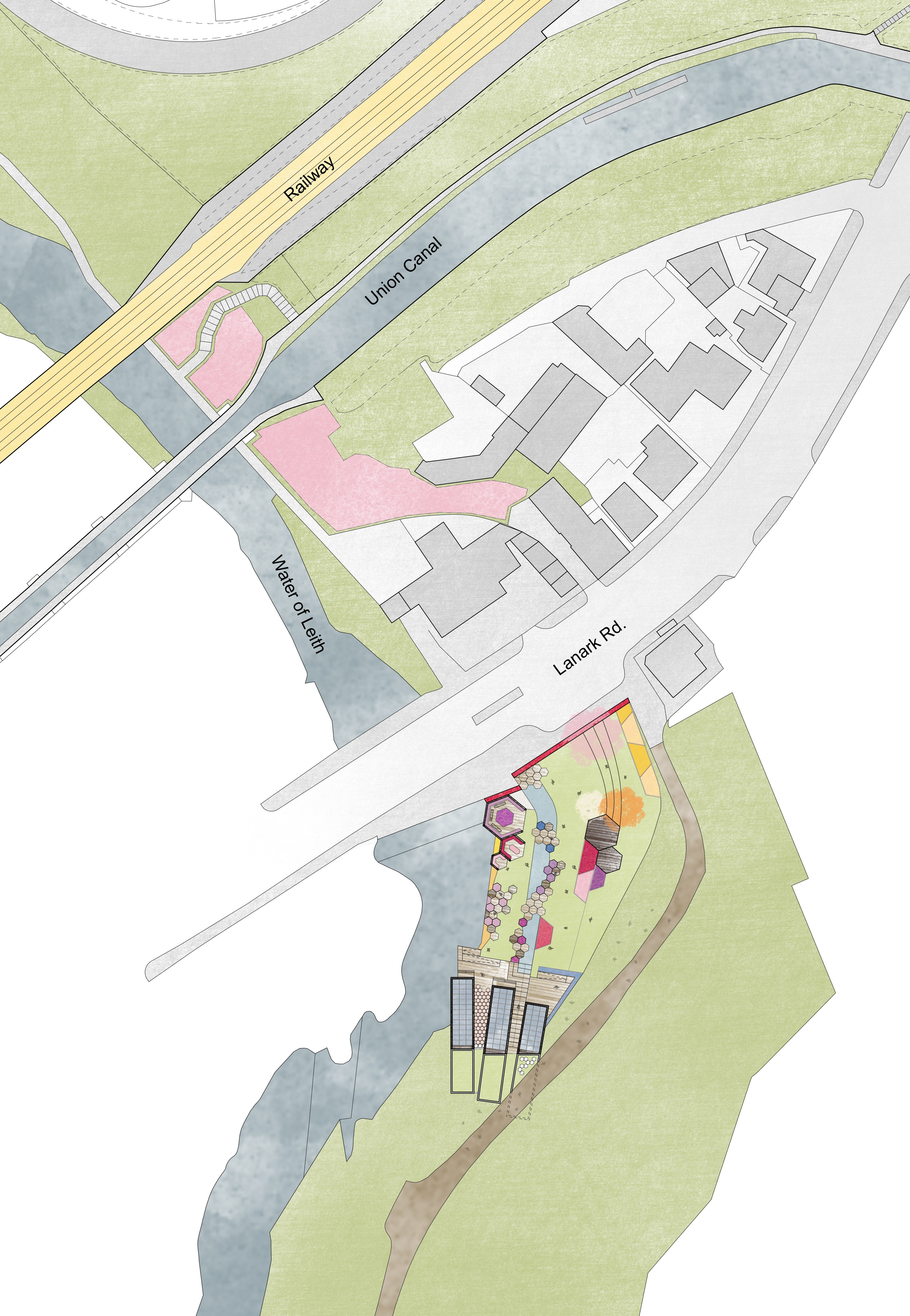 The site for HoneyPot sits on a currently abandoned pub, The Blue Goose, right across from Water of Leith Conservation Trust and Visitor Centre. This site was chosen fro its appealing location. It is where Water of Leith crosses with Union Canal. The front is facing a main road, Lanark Rd., with a bus stop in front, which allow easy access both by foot and public transportation. Slateford Station can also be found only 20 minutes away to the east. And most importantly, the area is rich with wild flowers and trees that are suitable for pollen foraging.