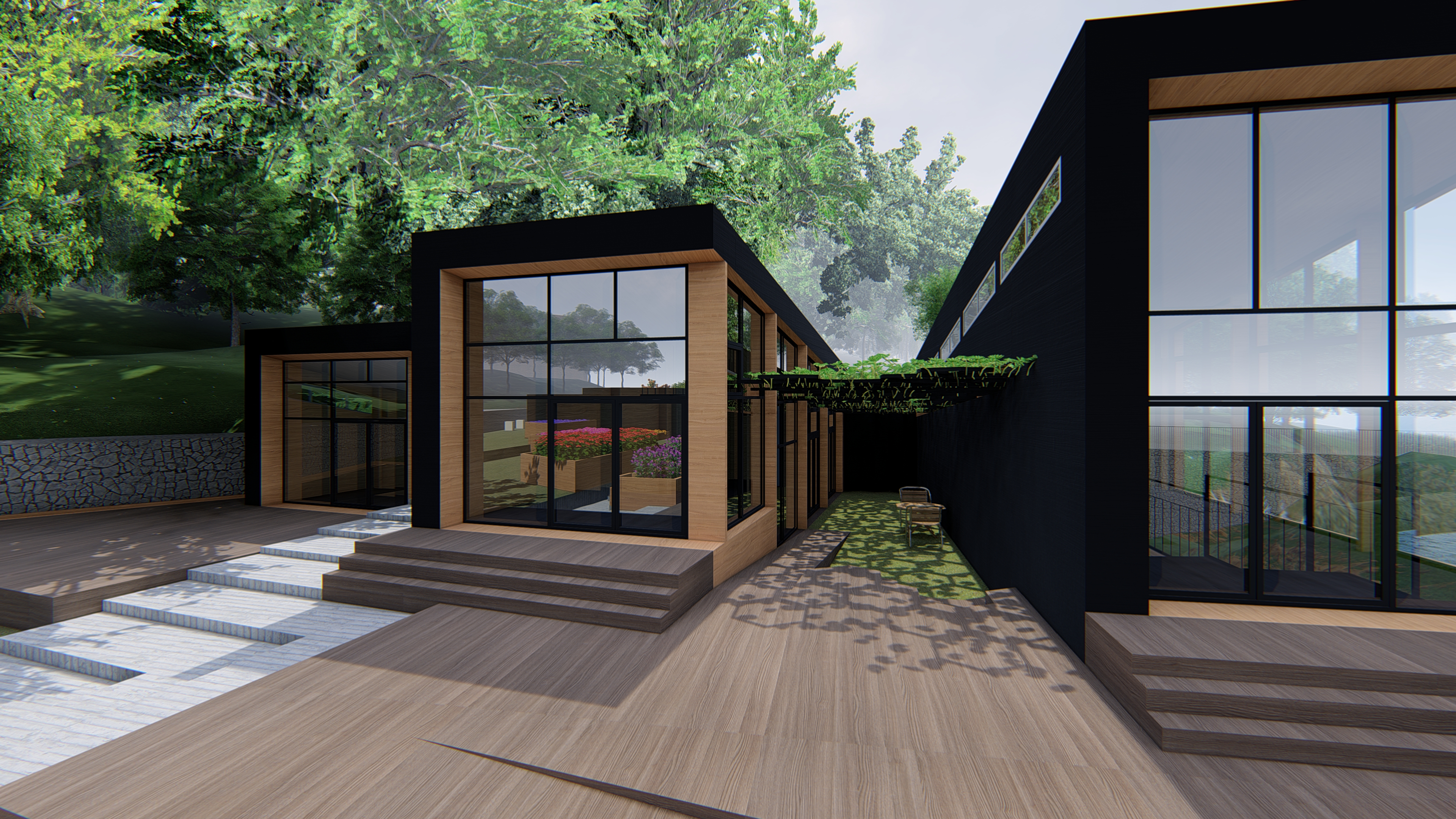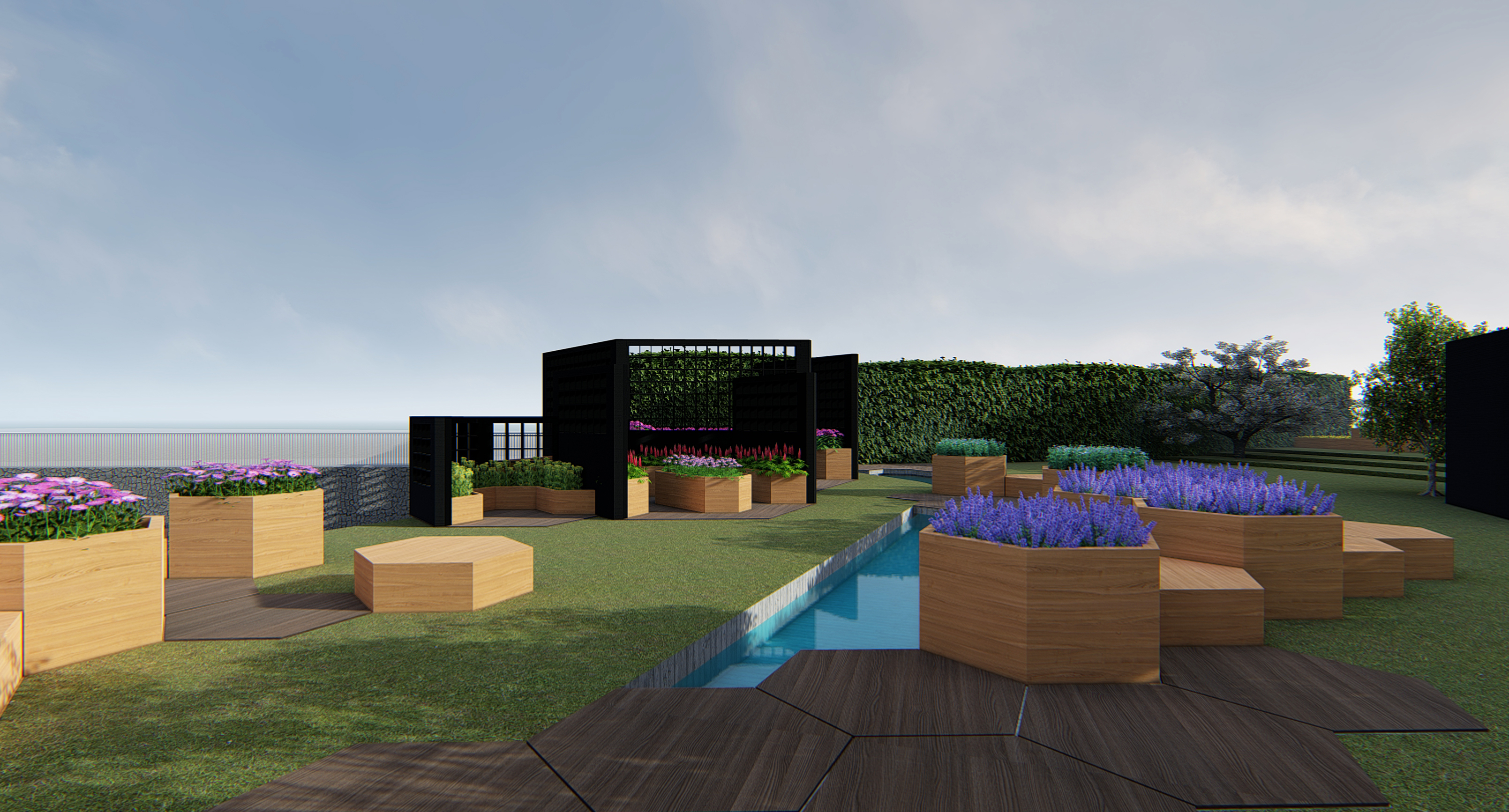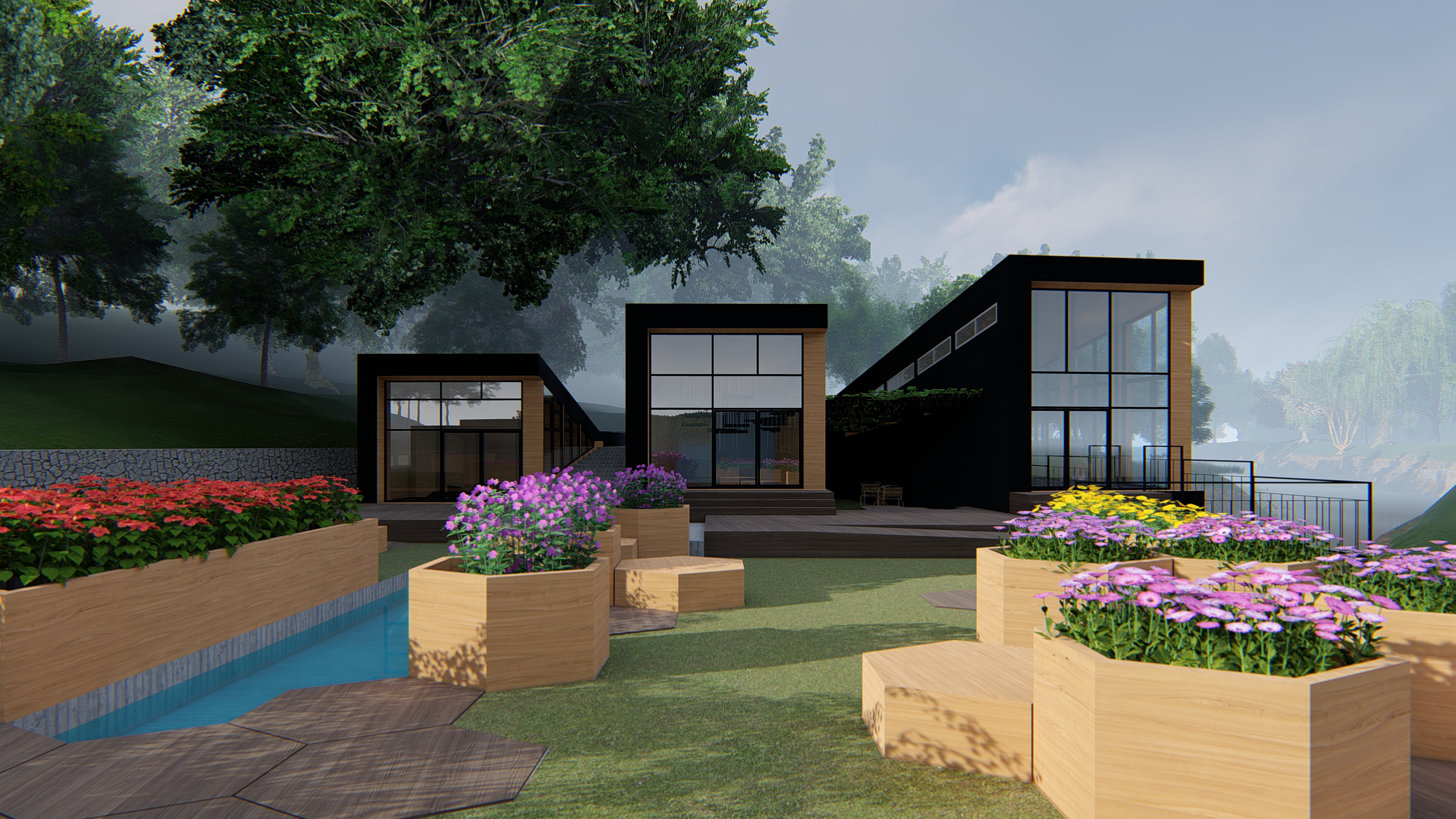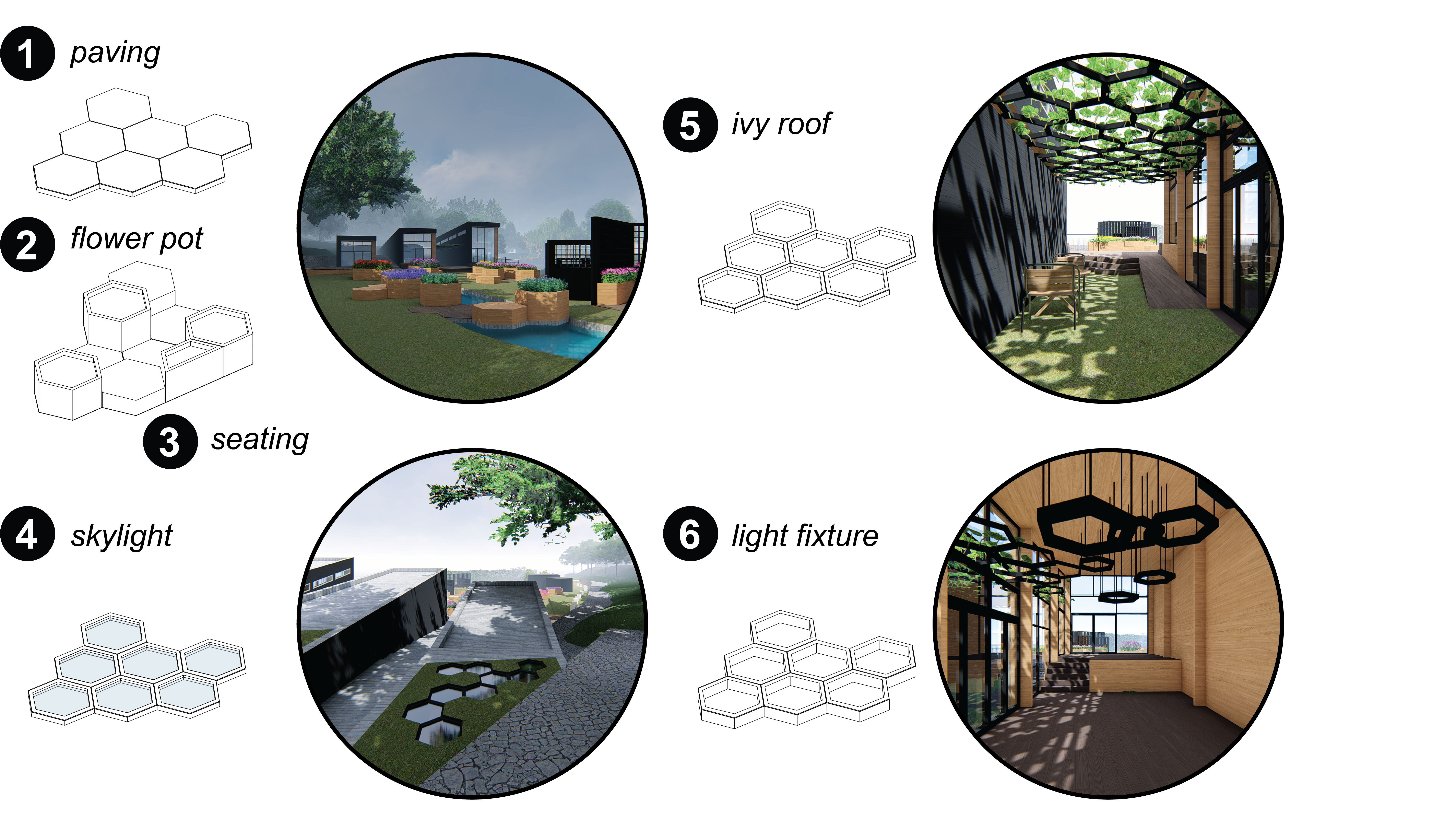 As can be seen in previous images, the design landscape design is inspired by the hexagonal shape of honeycomb. Different sizes are used in many purposes from the shape of storage sheds, isolated gardens, and many other details. The most prominent is wood bridges crossing over the pool. The varying heights is inspired by Giant’s Causeway in Northern Ireland. This allow different purposes for different height, where the flat one is floor paving, the mid-height is seating, and tallest is plant pot. The fourth purpose of the honeycomb is to create skylights, which can be found on top of production house, and in the public restroom connecting building west and centre sections. The fifth purpose is as a framed roof structure for ivy in the yard between the two building sections, providing shade while casting whimsical shadows. The last purpose is as hanging light fixtures that disperses from the ivy frame, found only in the summer cafe.