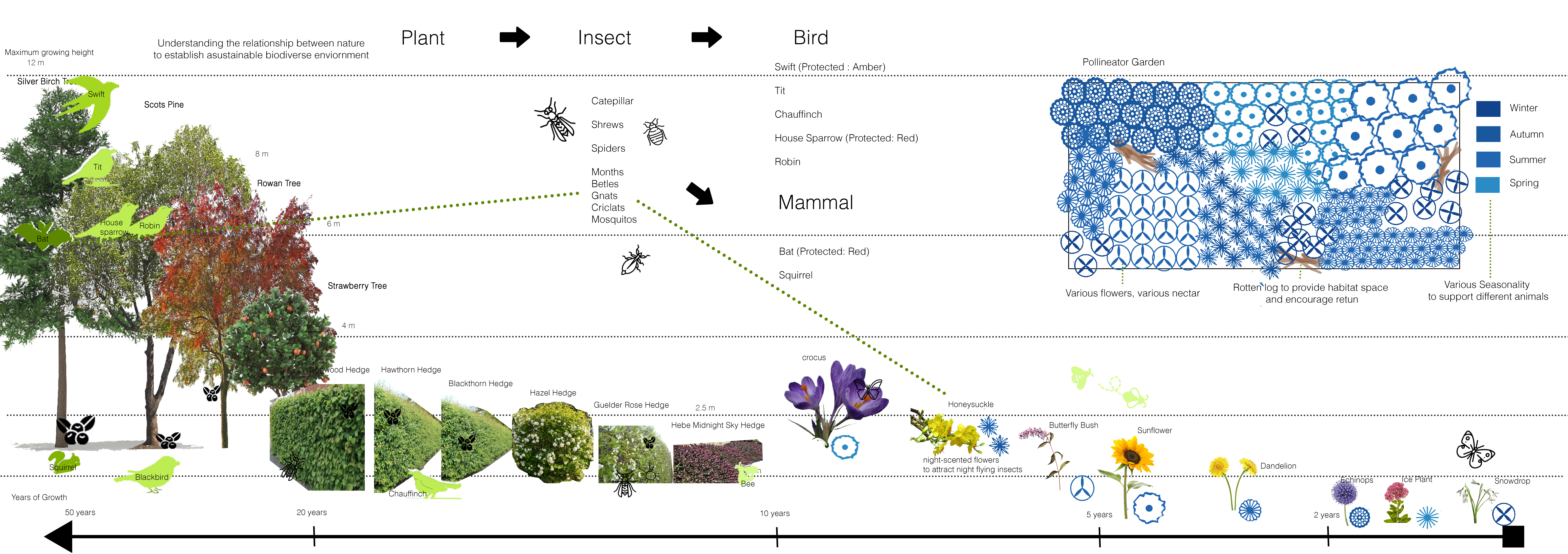 This section is about the landscape design of the project, which is mainly illustrating the animal habitat within the site. The relationship between nature is the key of this landscape which is explained with the chart below.