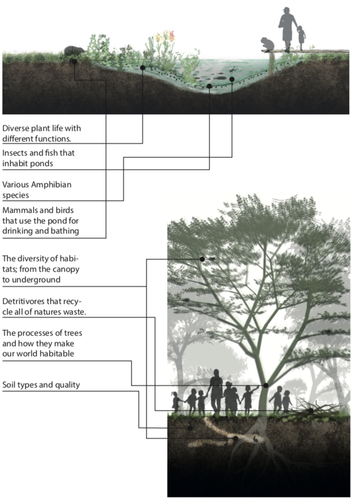 The wildlife pond, woodland and glade are all locations of high biodiversity. As such, one of their main purposes in this project is to be used for education and learning. School groups will come to the centre in order to learn about wildlife and environmental systems, through practical experience. The Learn- ing biomes provide areas where children can see and study creatures and plants. The classroom in the centre provides them with a space for theoretical learning, which can then be put immediately into practice. Below is just a handful of the myriad of things to learn about in nature and at the Millennium Acres Environmental Centre.
