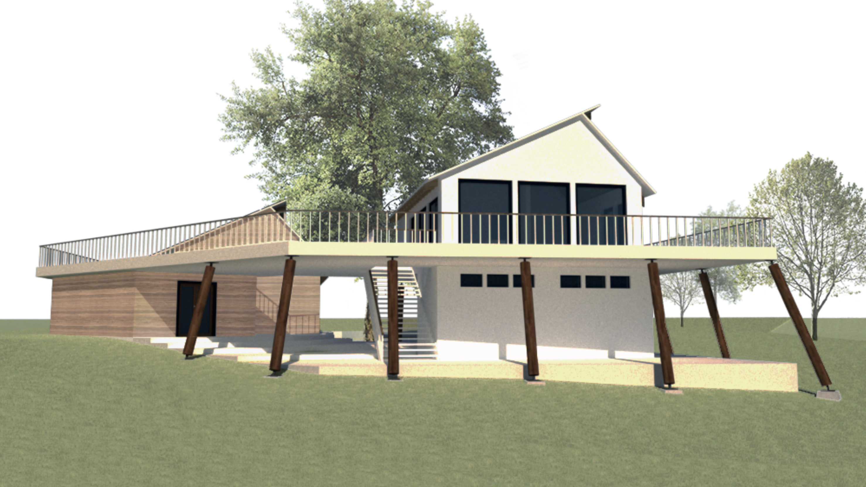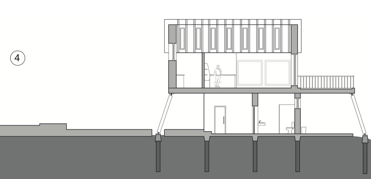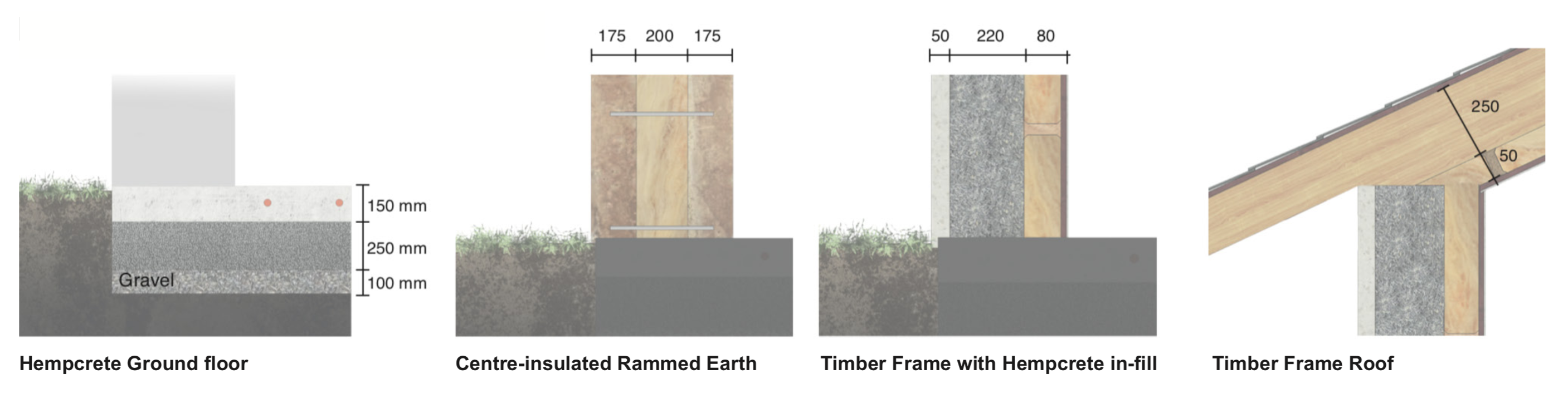 As the energy systems and building are designed to minimise environmental impact, so is the choice of materials and construction. The Learning centre will be made of ‘two leaf rammed earth, with an insulated cavity’. The benefits of this are two fold. First it strikes an ideal balance between thermal mass and insulation, and second it preserves the rammed earth aesthetic on both faces, which would otherwise be lost if insulated on the inside or outside. For the cafe, more conventional timber frame construction is chosen, however, it is in-filled with hempcrete to provide both thermal mass and insulation. Additional insulation is added on the inside to maximise thermal performance, and close the heat bridges caused by the timber studs. Lime is used in place of concrete as it has a much lower carbon footprint. The roof structure is a simple timber frame structure, with a gable end.