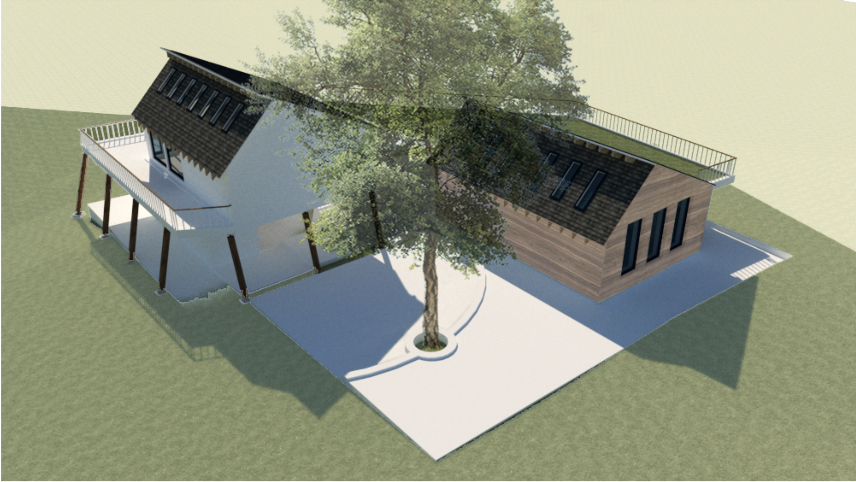 The building is designed to be a ‘stopping point’ along the walk through the woodland, rather than an ‘end destination’. In addition to integrating spatially with the path through nature, it also aims to be a demonstration of how buildings can integrate harmoniously with, and have a minimal impact on, nature in terms of construction and use. All the materials chosen for the construction are low impact, natural materials, which can be sustainably sourced, and recycled at the end of life. The roof design accommodates an extensive solar array which will meet the centre’s energy demands. The ‘wrap-around’ veranda that connects the two buildings is finished in two surfaces; wood decking around the cafe to provide a large seating area, and sedum above the gallery, which again, emphasises the connection with nature and greenery. The buildings are arranged around a courtyard to the north side, whose ‘centre-piece’ is one of the trees that pre-dates the millennium plantation. The fact that the courtyard won’t receive much direct sunlight, means that it will make for a pleasant shaded seating area, and more specifically, an excellent outdoor learning space for school and activity groups.
