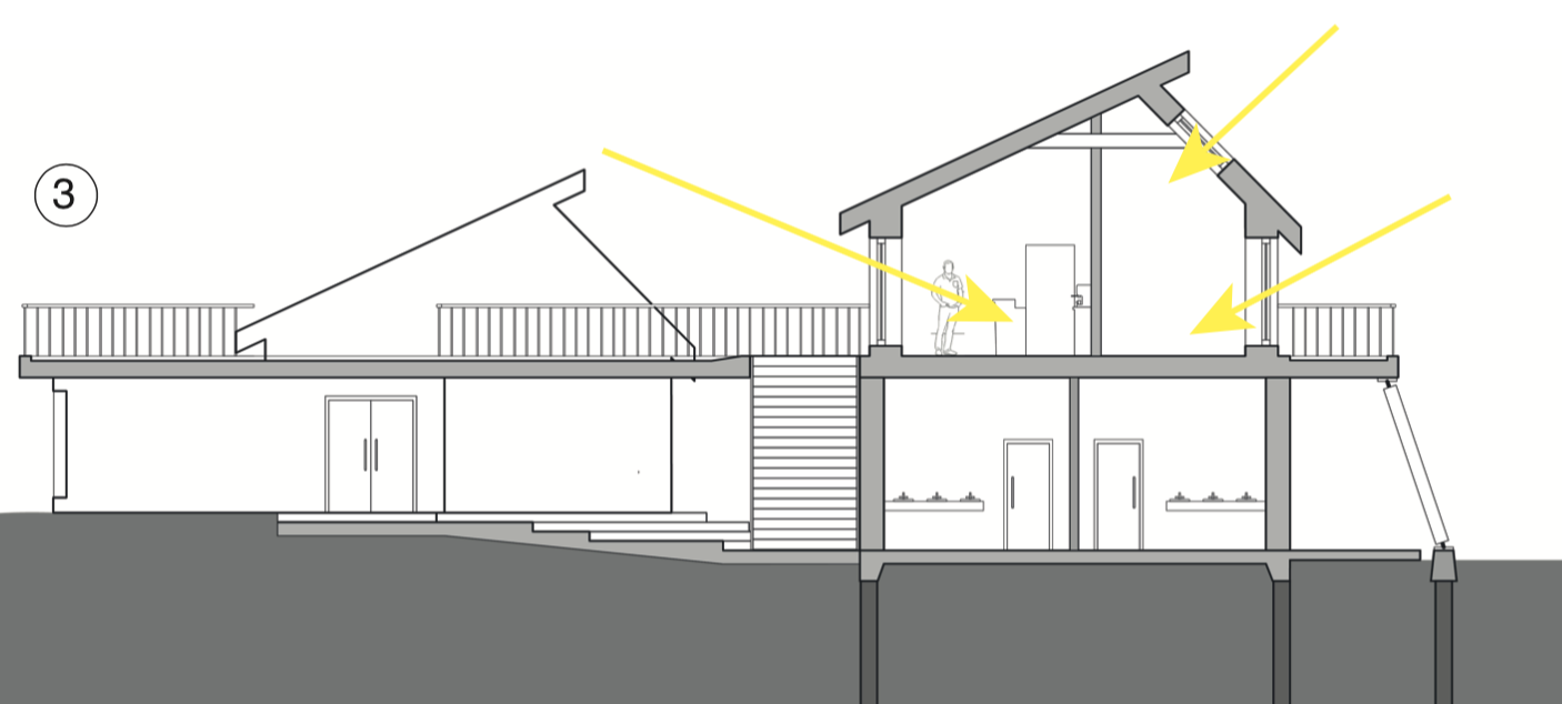 The Gallery and Classroom work together to capture and store solar heat. The large amount of south facing glazing on the Gallery’s southern wall captures heat from the sun. The high thermal mass of the partition between the Gallery and Classroom captures and stores this heat. Eaves above the gallery windows shade the windows from high summer sun, when the heat isn’t needed, but captures low winter sun. The result is a system that stores and distributes heat when it’s needed, and shields and cools when it is not. Of course the passive design isn’t sufficient to keep the whole building warm throughout the year. When additional heat is needed, the radiant floor system provides the necessary warmth to keep the building comfortable. A radiant floor is chosen here because it requires low grade heat (40 – 50 degrees Celsius), which makes it ideal to work in conjunction with a ground/water source heat pump, as they operate at their highest efficiency when heating water to this temperature range.