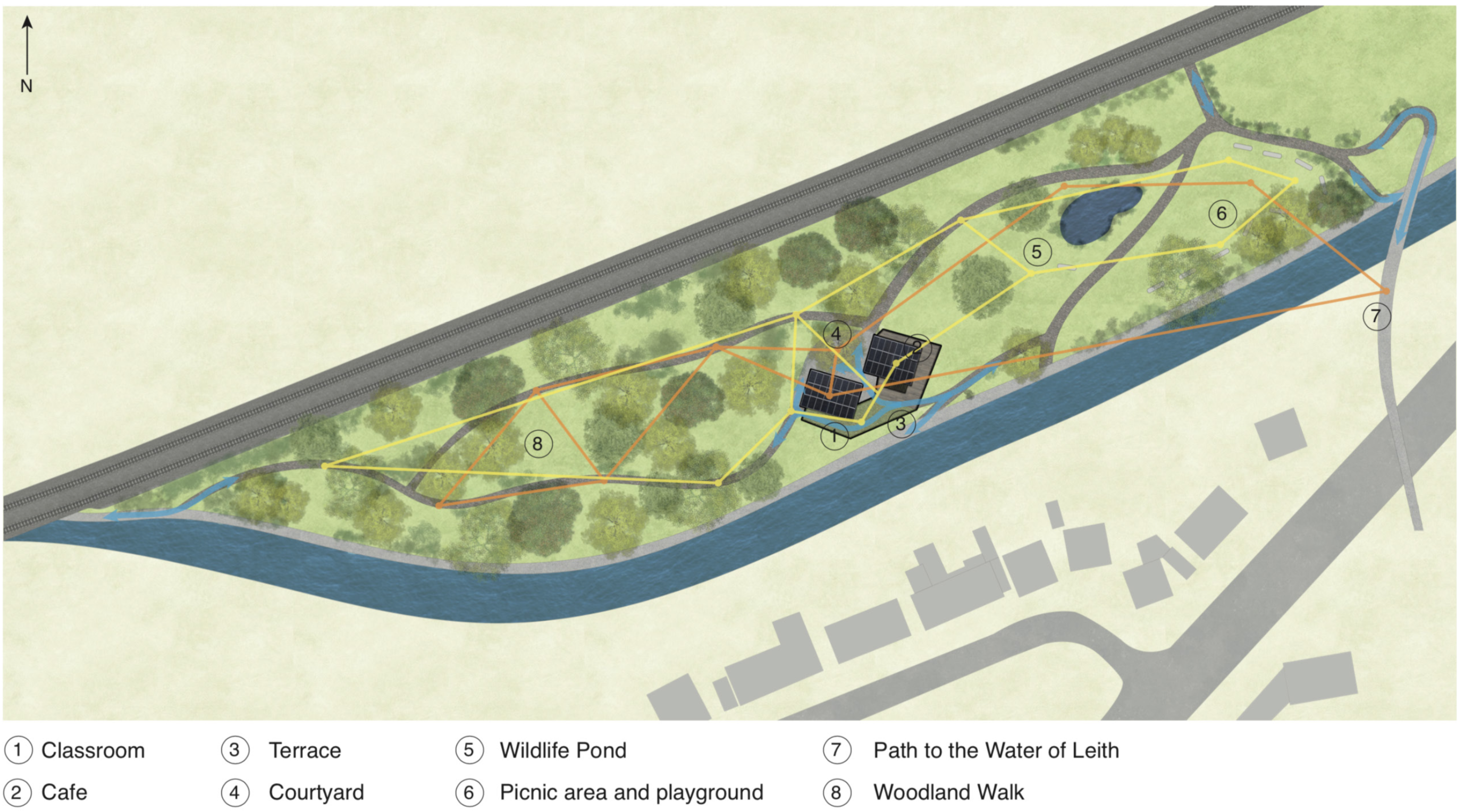The Site has good pedestrian and cyclist accessibility, but is non existent for larger vehicles apart from canal boats. To the West the canal connects to Kingsknowe road, where Kingsknowe railway station is located, serviced by the train between Edin- burgh and Glasgow. To the east, the Canal tow-path leads to the Slateford Viaducts where a staircase connects the Canal and street level. Here is the most convenient access for visitors coming by car, as they can park in the Sainsbury’s parking lot nearby. Aside from the canal tow-path, there are two other paths connecting the site directly to the adjacent neighbourhoods. To the South, a bridge connects the site to Lanark Road, and to the North, a tunnel under the railway leads to neighbourhoods of Long- stone and Redhall.